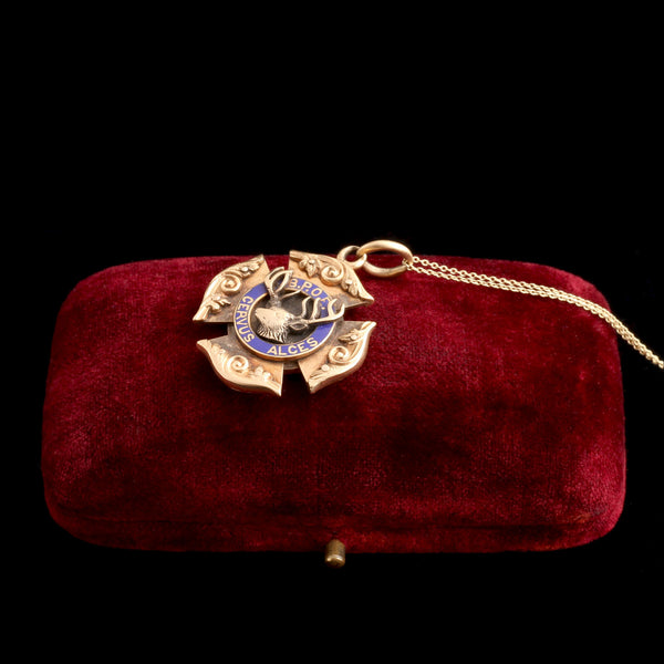 Made in the early 20th century, this gold and enamel medallion was once worn by a member of the Benevolent and Protective Order of Elks - an American fraternal organization founded in 1868 which is known for its charitable work and community service. The hand pointing to the clock symbolizes the "Eleven O'clock Toast," a ceremony dedicated to remembering members who are absent ("the homecoming of those who wander") or deceased members ("the mystic roll call of those who will come no more"). A lovely tradition, but to be honest, when we first saw this piece our first thought was: "it's wine time."