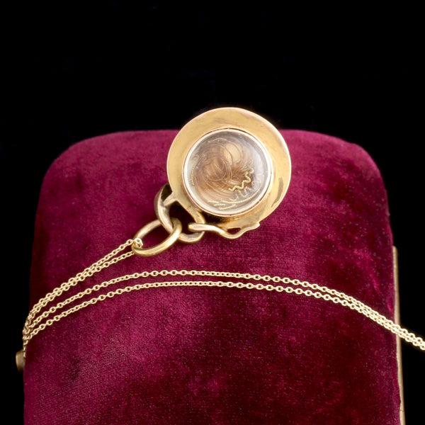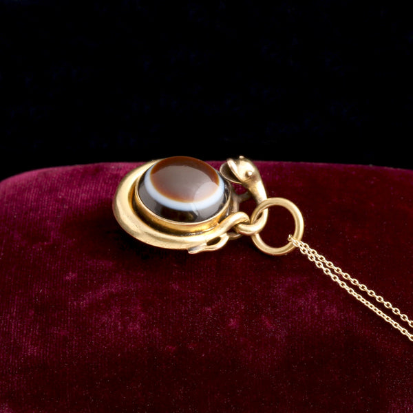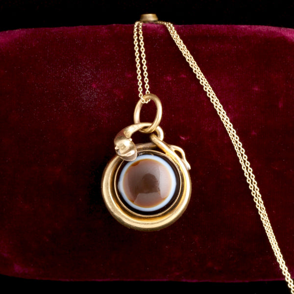 Smile! Mid-19th century snakes in jewelry always inexplicably look so cheerful. This friendly guy is wrapped protectively around a cabochon of banded agate. As far back as Ancient Rome, this layered stone was the choice material for giving dimensional life to carved cameos, but in the Victorian era it was adopted as a hypnotically pretty material on its own. A glass locket hides on the reverse.