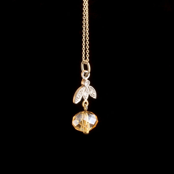 Little and lovely, this Edwardian pendant features a diamond studded trefoil flower with a pendant faceted citrine bead on a new 18" 14k gold chain.