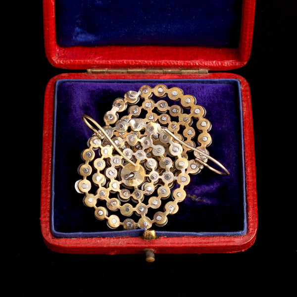 The early manufacture of cut steel jewelry was painstaking work: each individual stud was faceted by hand and then riveted to a base plate of silver or brass. The brilliant “gems” were intended for evening wear, as their adamantine luster was considered most spectacular under candlelight. These jewels were in great demand through the late eighteenth and early nineteenth centuries, and at the height of the fashion, a fine piece of cut steel jewelry could command a higher price than gold.