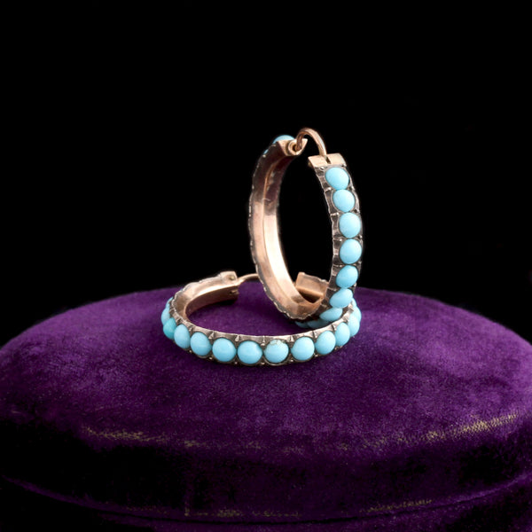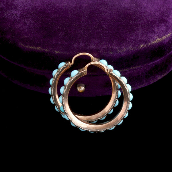 These late Georgian earrings are made in yellow gold and silver and set with turquoise cabochons all the way round the curve of the hoop. The hoops measure just shy of 1" in diameter and have secure hinged ear wires which lock into place.
