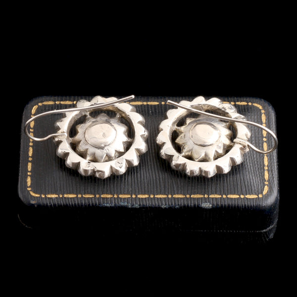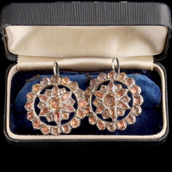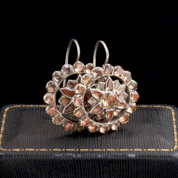 These cluster earrings are a fine example of late 18th-century Iberian jewelry, made in silver and set with richly hued topaz. The faceted stones are arranged in tight concentric rosettes—an arrangement typical of Portuguese and Spanish work from this era, when regional artisans developed their own distinctive style apart from the rest of Europe.