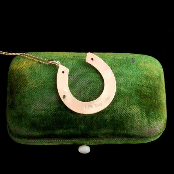 HUMANS HAVE CARRIED and worn lucky charms forever. Although the 19th and 20th centuries were thought to be ages of reason and science (and definitely not superstition) people still kept horseshoes close, just in case. Iron was believed to guard against trouble, so full-size shoes were nailed above doorways. The crescent shape also reached back to much older, pre-Christian lunar goddesses of protection. British hallmarks give us the date of this amulet's creation: 1892. Seven lucky nails amplify the good luck.