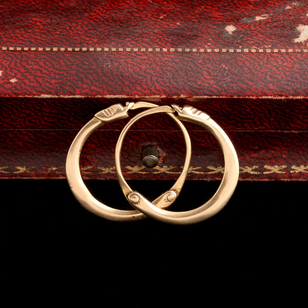 A snake with its tail in its mouth forming an endless circle is also known as an ouroboros. It is a symbol of love everlasting, and was a favorite jewelry motif of the early 19th century. In Sicily, where ancient Greek, Byzantine, and Islamic goldworking legacies intersected, snake-form jewelry flourished. In these sleeper-style hoops, the softly modeled heads and turned-up snouts, high-carat gold and absence of gemstones are typical of Southern Italian work. In that region, symbolism mattered more than anatomical realism.
