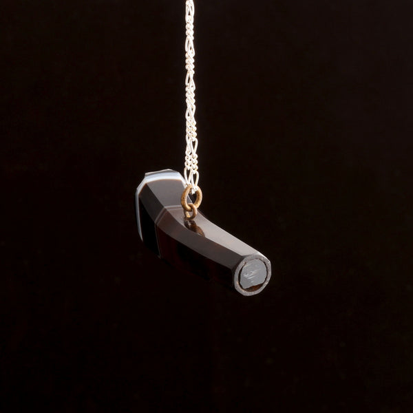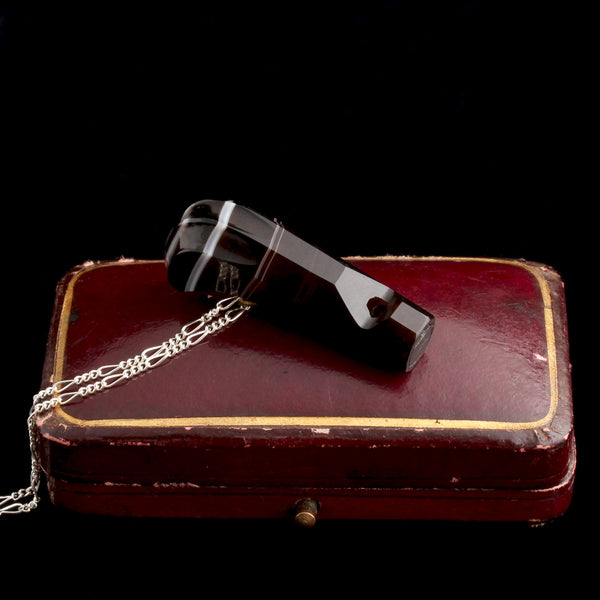 Banded agate has been carved in layered relief since antiquity; its natural stripes allowed artists to work light against dark to create dynamic cameos. In the Victorian period it reappeared as a fashionable decorative stone, cut into somber striped beads and cabochons. This pendant takes the material into the late nineteenth century’s world of portable gadgets: a whistle carved from a single block of agate. And it works!