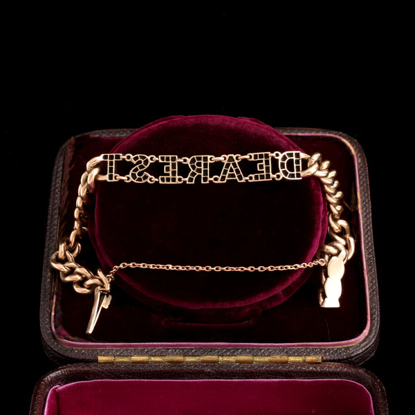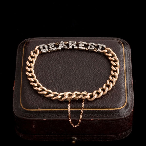 Antique jewelry collectors tend to have a soft spot for pieces that feature words, names, sentiments and places. The jewels that feature lettering rendered in enamel or engraving are stunning. An when those letters are formed by diamonds? Sublime. A grail piece, this late Victorian bracelet is modeled in silver and gold, the pet name "dearest" sparkles with a total of 60 rose cut diamonds.