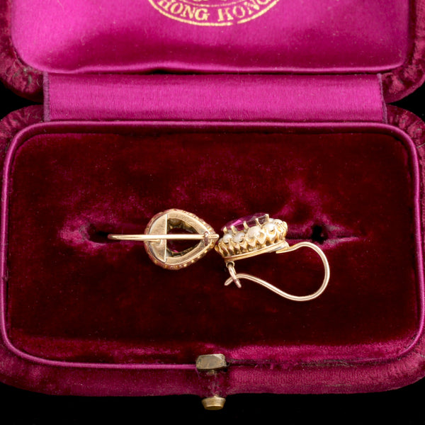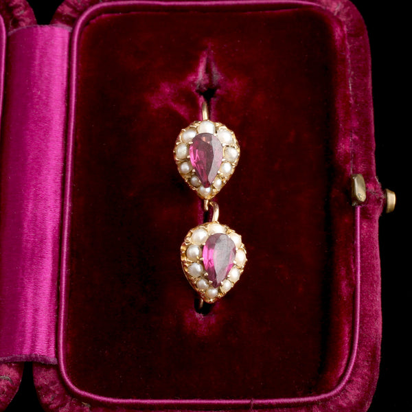 A classic (and classy) pair of Victorian earrings modeled in the shape of a heart with a pear-shaped garnet set within a halo of seed pearls.