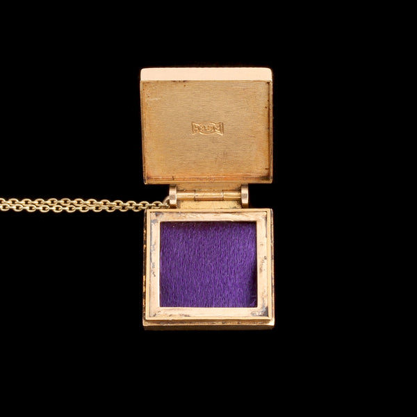This is a mine-to-market locket. Instead of nuggets or geological cross-sections set whole, the front is carefully tiled with four squares of polished gold-in-quartz. Each segment carries its own pattern of pink and gray veining, so the face is like a patchwork of mineral specimens arranged with Victorian precision. The reverse is engraved with a flowing “PES” monogram, which gives it a more personal feel than most frontier souvenir pieces. Inside, the locket is missing its original glass lens but still opens smoothly.