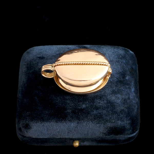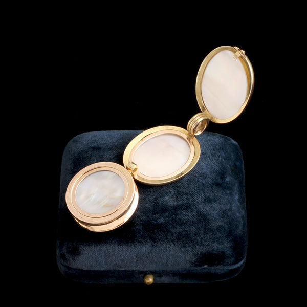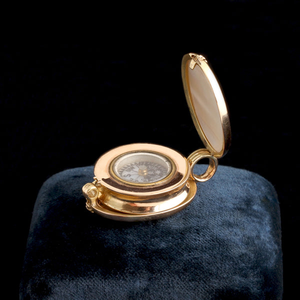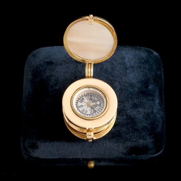 A finely engineered Victorian locket is built around a miniature working compass. The outer form recalls the brass pulley wheels used aboard 19th-century ships - a nautical reference to exploration and mapping. Compasses appear in Victorian jewelry as sentimental keepsakes for sailors and symbolic references to steadiness, direction, and finding one’s way. The mechanism is housed in gold and the interior is accessible so the wearer could keep a photograph inside. Mother of pearl was chosen for the panels perhaps because it carries an echo of shells. In the 19th century, a trusted compass was both a navigational tool and a talisman that reassured travelers heading into unfamiliar territory. What keeps you moving in the right direction?