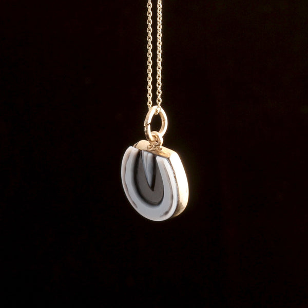 HUMANS HAVE CARRIED and worn lucky charms forever. Although the 19th and 20th centuries were thought to be ages of reason and science (and definitely not superstition) people still kept horseshoes close, just in case. Iron was believed to guard against trouble, so full-size shoes were nailed above doorways. The crescent shape also reached back to much older, pre-Christian lunar goddesses of protection. Here, nicolo onyx is employed cameo-style to convey the details of the horseshoe and hoof.
