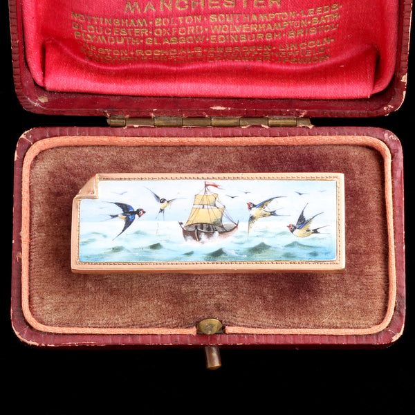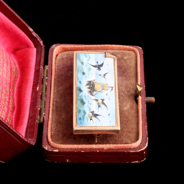 In the 19th century, swallows symbolized safe return and homecoming. Sailors often tattooed them on their forearms as a promise of survival — if you saw swallows circling from the deck of your ship, you knew land (and safety) were near. This expertly enameled brooch captures that symbolism with the absolute highest level of craftsmanship: a ship sails steadily on choppy seas while multiple swallows wheel and dart above, guiding it safely to shore.