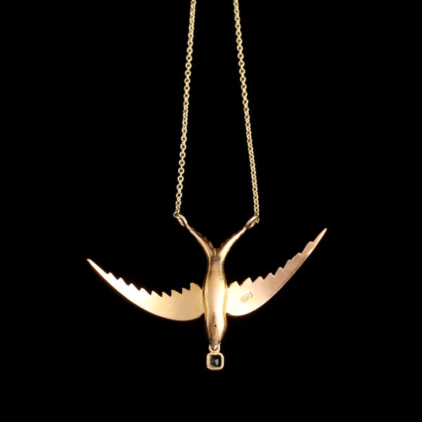 In the northern hemisphere the migration of the swallow is one of the early indications of spring and sign of the fertile period to come. According to lore, swallows were a welcome sight to voyage-weary sailors who believed the little birds prevented ships from getting lost and led them into safe harbor. Modeled in 15k gold with an emerald in its beak, this late Victorian swallow was once a brooch, we've removed the pin and added an 18" gold chain to make it into a necklace.