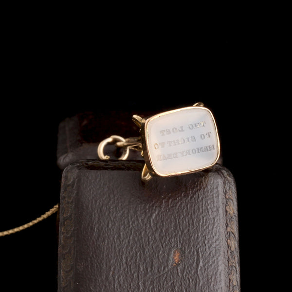 Engraved in reverse on ethereal chalcedony, the phrase “Tho lost to sight, to memory dear” was a 19th-century expression of remembrance—often exchanged between lovers or friends facing long separation. The sentiment reflects the Victorian preoccupation with loss, distance, and the endurance of affection across time and space. Originally meant to press into wax as a private message, this exceptionally elegant seal now hangs as a pendant: it's a reminder that what’s cherished in memory is never truly gone.
