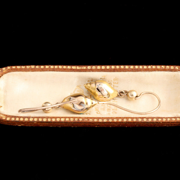 Small in scale but big on charm, these late Victorian shell earrings are modeled in gold and set with graduated turquoise cabochons.