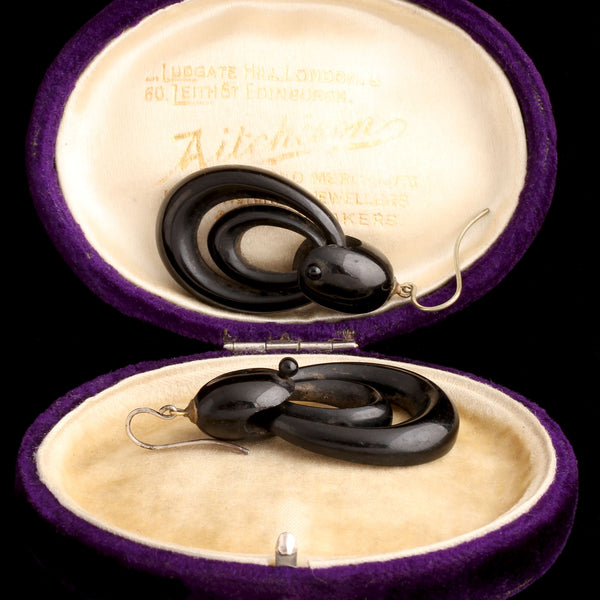 These carved jet earrings were once part of a Victorian woman's mourning ensemble. In the first stages of mourning the bereaved wore only black, so any jewelry also had to be dark-colored and preferably matte. Jet, mined in the Yorkshire town of Whitby, fulfilled these requirements for mourning jewelry extraordinarily well and was popularly used by the Victorians until the mines were more or less exhausted of their supply. Jet itself is a mineraloid formed by the fossilized wood of the monkey-puzzle tree, and the jet harvested in Whitby dates back to the Jurassic period (that makes it 182 million years old). These lightweight earrings are carved in a modern double hoop design with silver ear wires.