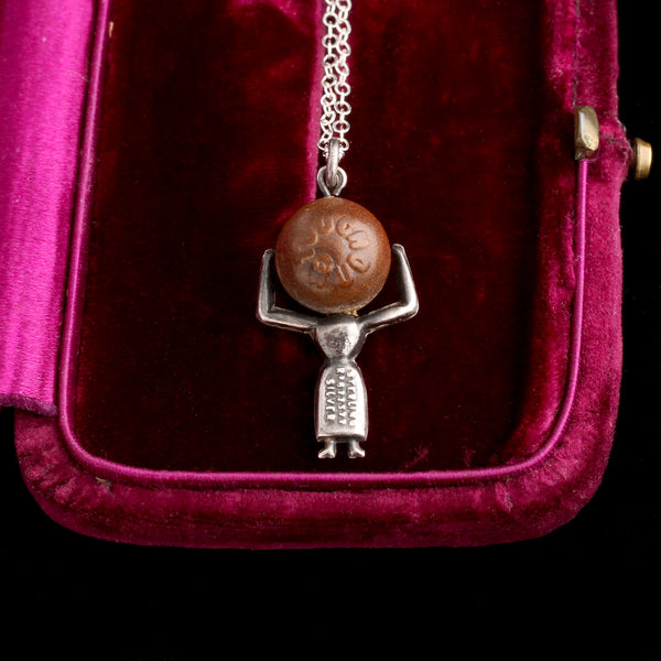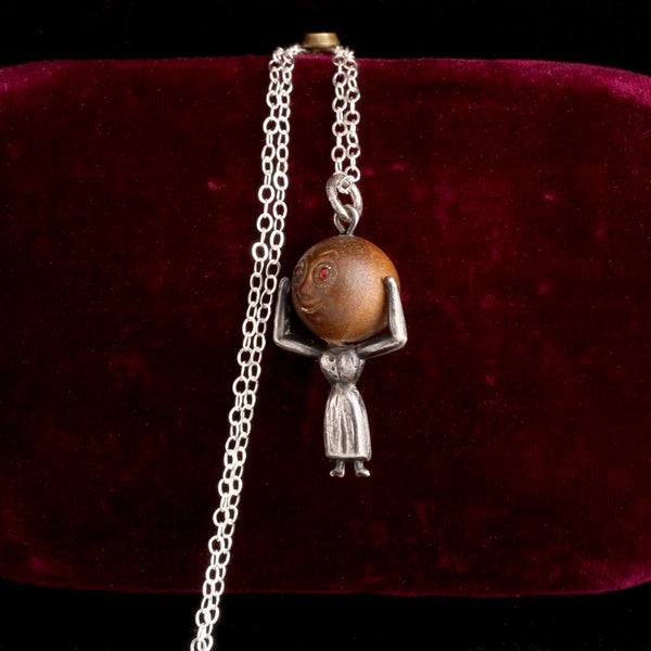 The superstitious expression "touch wood" or "knock wood" is used in situations where a perceived misfortune is about to happen. The phrase is thought to have originated in the 16th century when Catholic clergy sold believers wood fragments they claimed to be pieces of the "true cross" with the talismanic power to ward off bad luck. Many centuries later, the "Touch Wud" charm was designed by a Londoner named Henry Brandon. These goofy, rare silver-limbed little men feature a round wooden body with a smiling face and the words "touch wud" carved along the back side. But have you ever seen a Touch Wud LADY??? And with actual garnets for eyes, rather than glass? We haven't! These lucky amulets were given to soldiers bound for the battlefield by their sweethearts during the first World War. Originally, these charms came in a small leather pouch along with a poem which read: